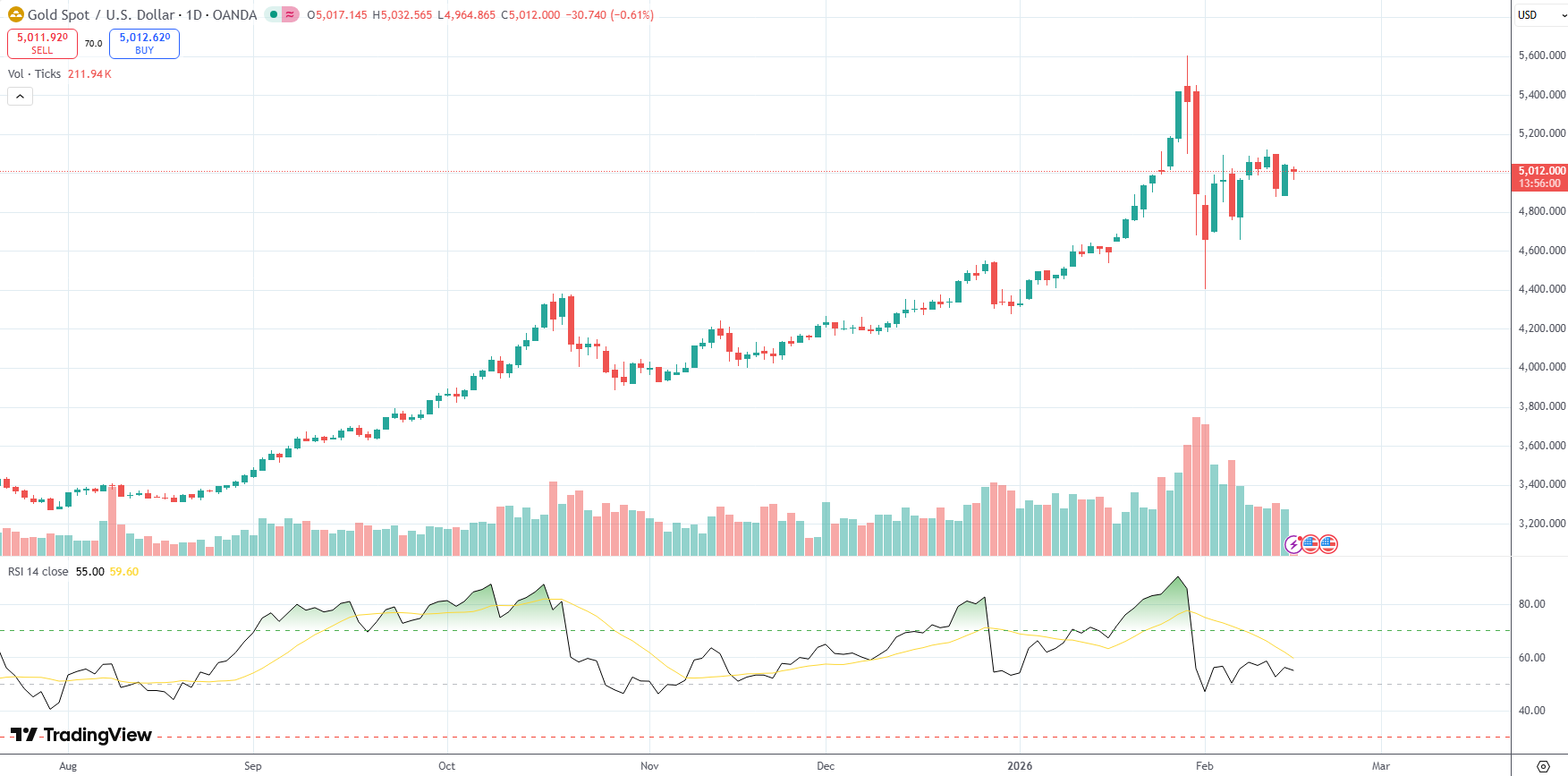 Spot Gold was last down 0.61% on the day to trade at $5,012.00 per troy ounce.