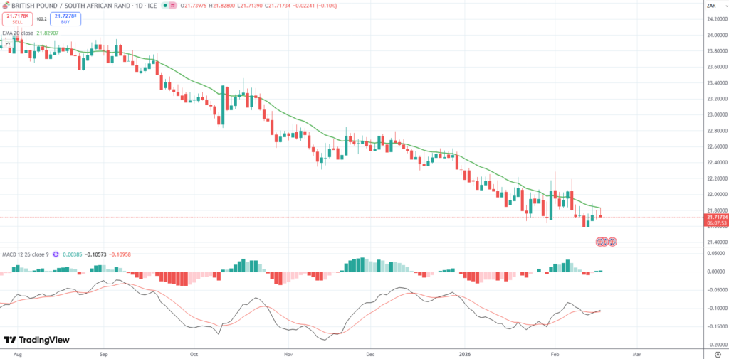 The GBP/ZAR currency pair was last down 0.10% on the day to trade at 21.7173.
