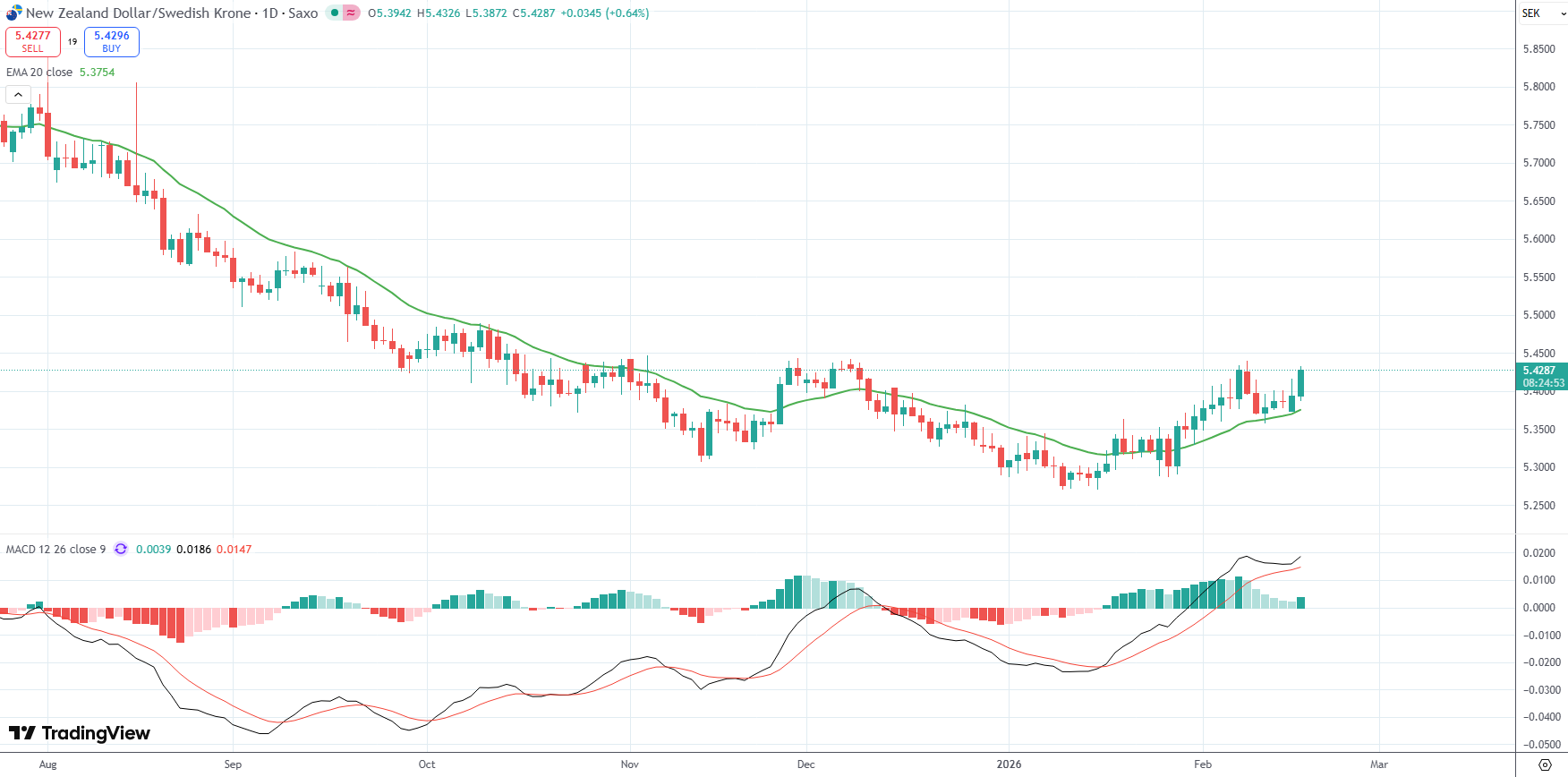 The NZD/SEK currency pair was last up 0.64% on the day to trade at 5.4287.