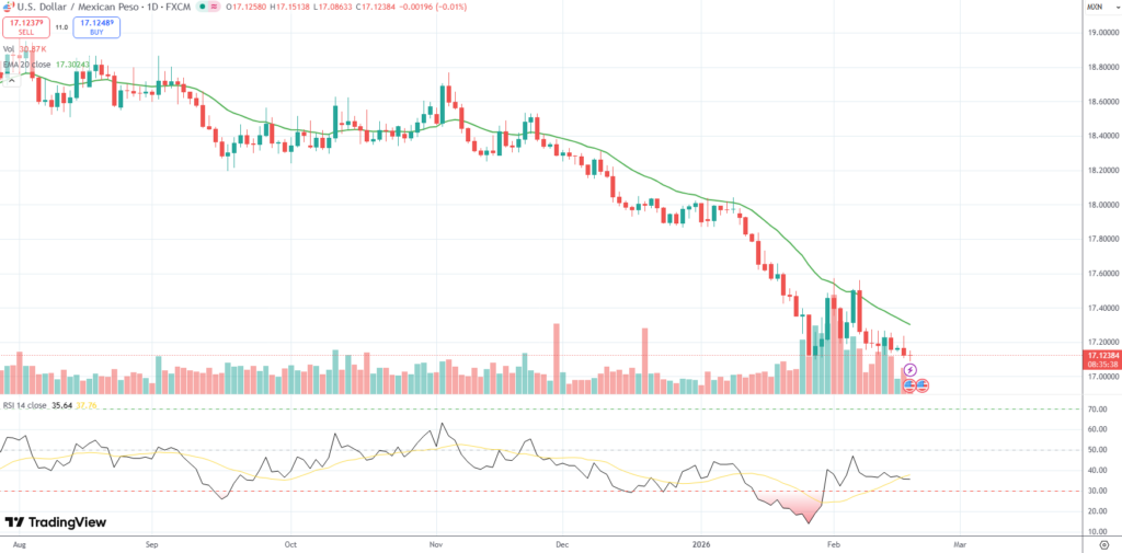 The USD/MXN currency pair hovered above a 20 1/2-month low of 17.0863 on Wednesday ahead of the minutes from the Federal Reserve’s January meeting, which may provide fresh clues over monetary policy trajectory.