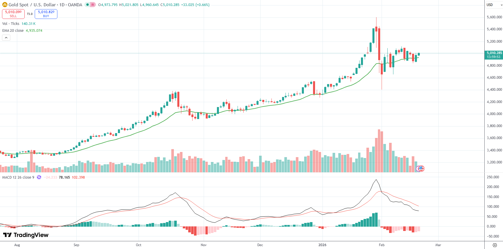 Spot Gold was last up 0.66% on the day to trade at $5,010.28 per troy ounce.