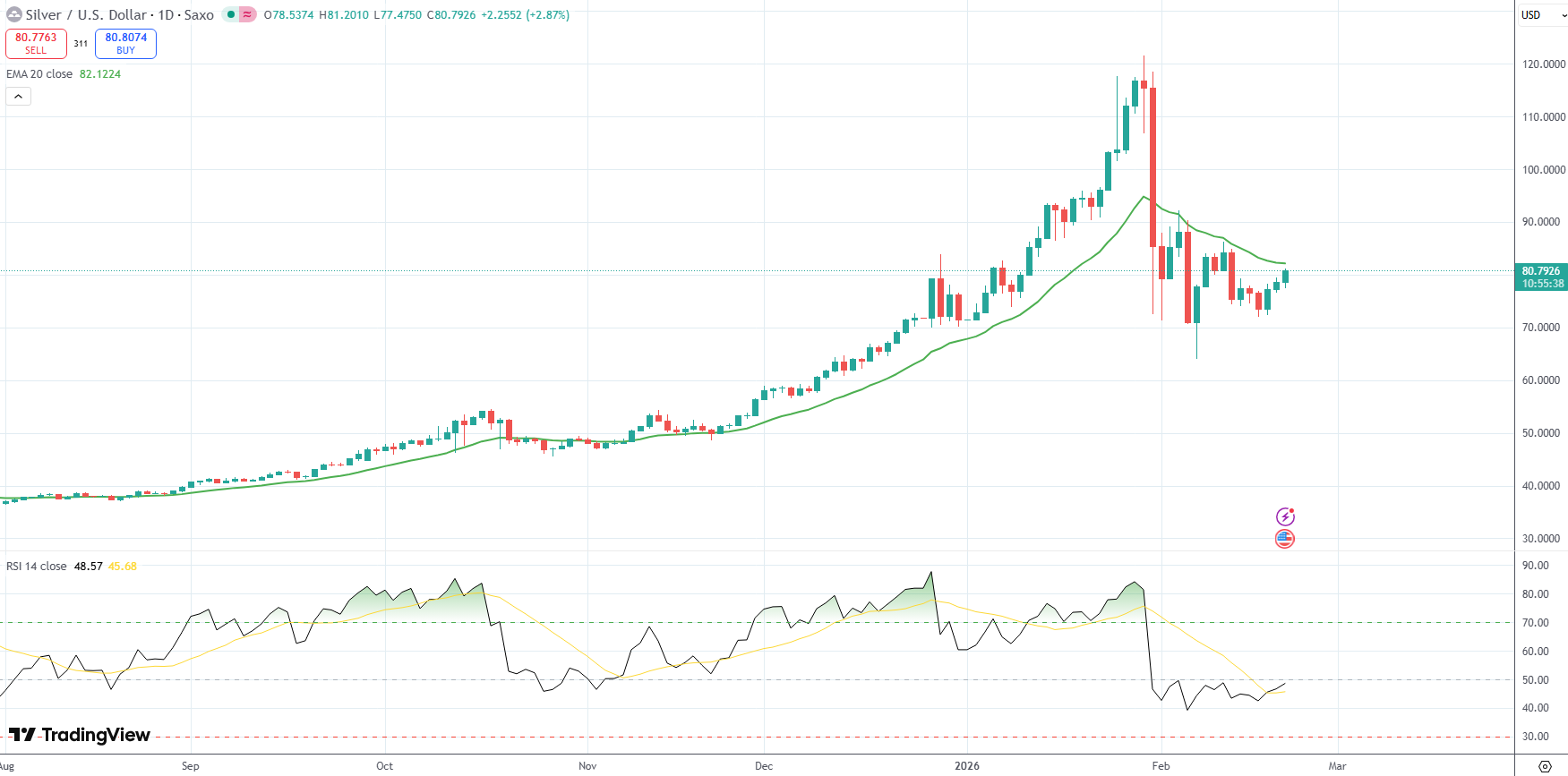 Spot Silver was last up 2.87% on the day to trade at $80.79 per troy ounce.