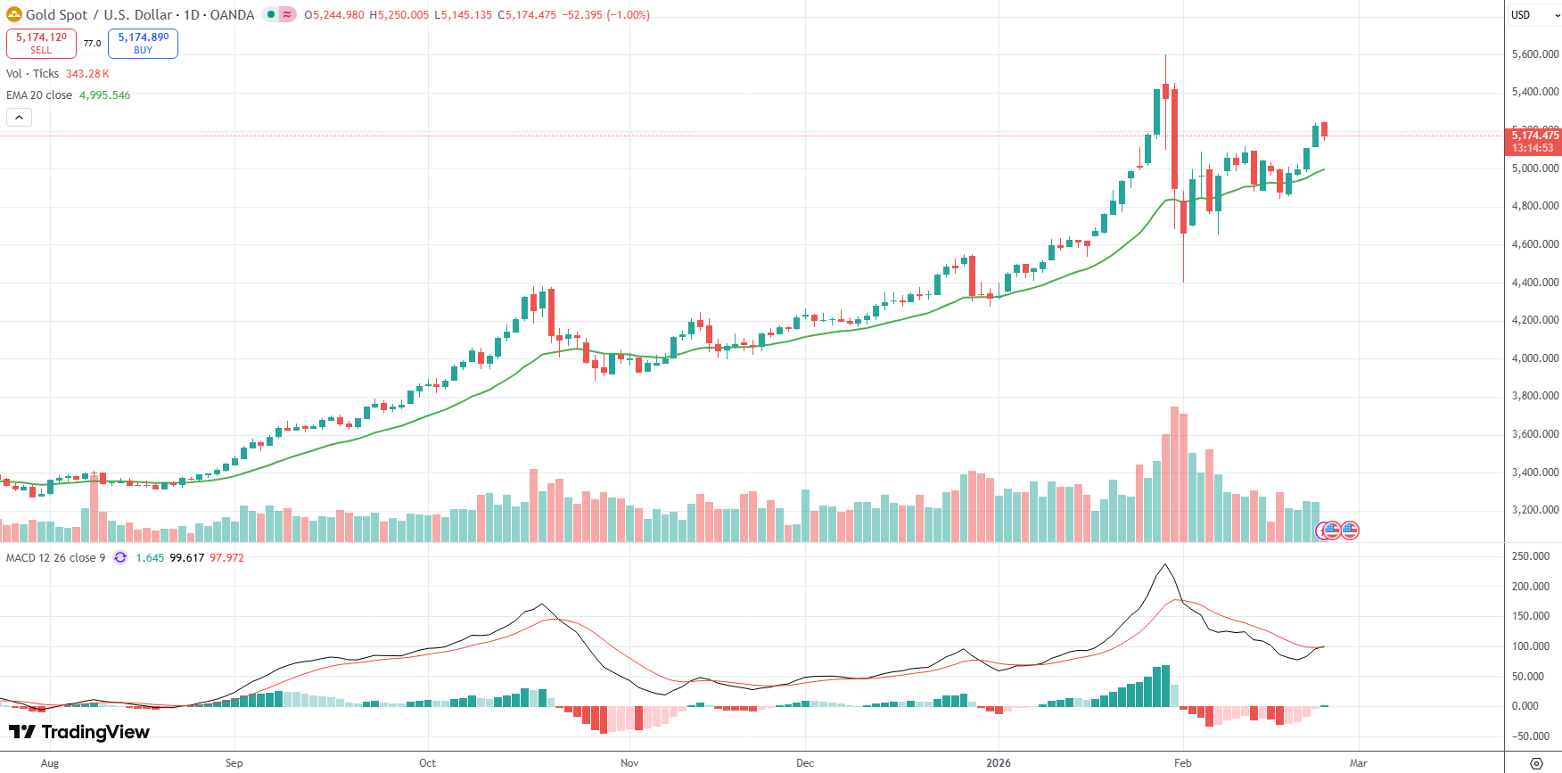 Spot Gold was last down 1.00% on the day to trade at $5,174.47 per troy ounce.