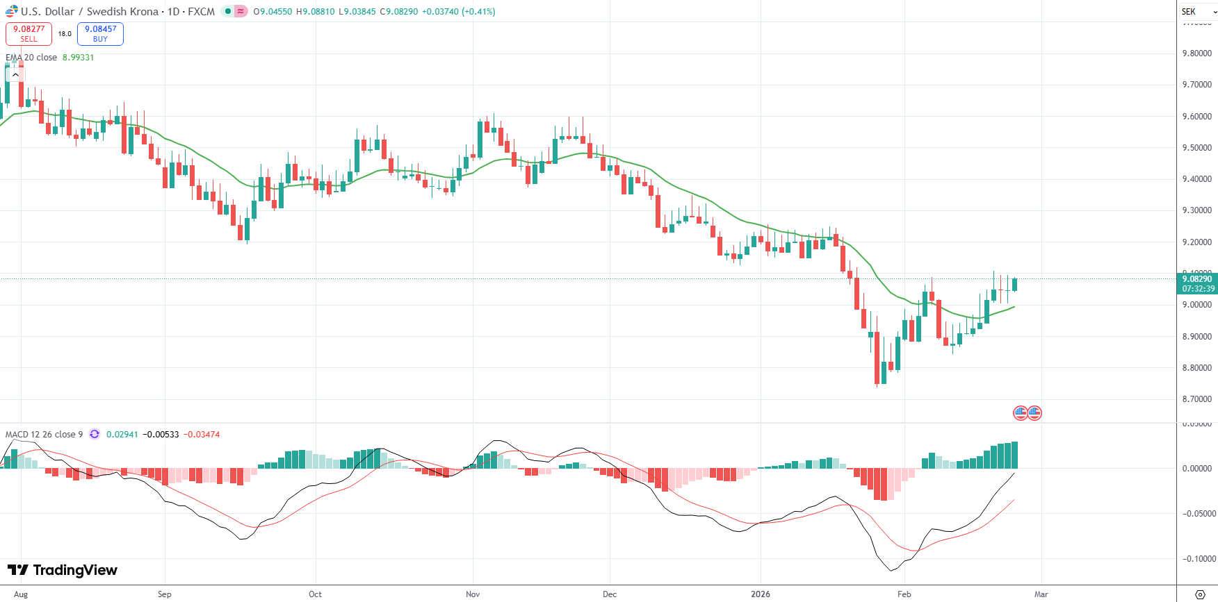 The USD/SEK currency pair was last up 0.41% on the day to trade at 9.0829.