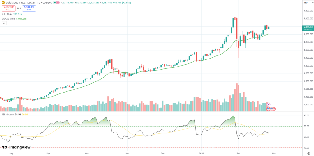 Spot Gold was last up 0.85% on the day to trade at $5,187.63 per troy ounce.