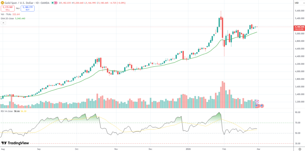 Spot Gold was last down 0.09% on the day to trade at $5,180.44 per troy ounce.