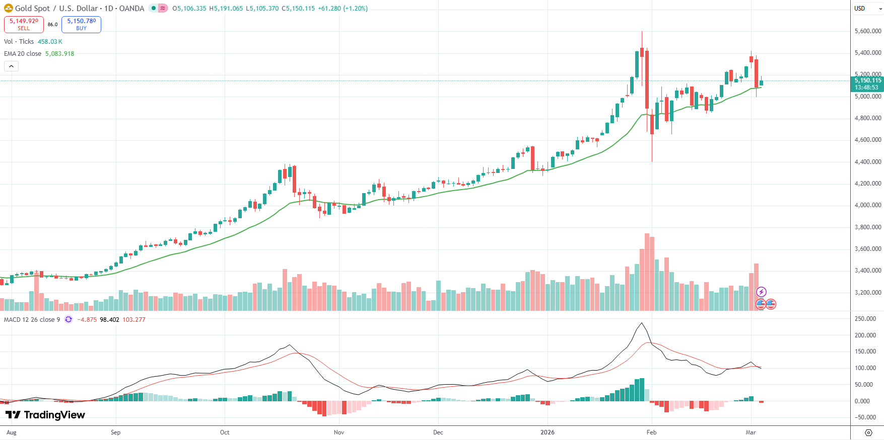 Spot Gold was last up 1.20% on the day to trade at $5,150.11 per troy ounce.