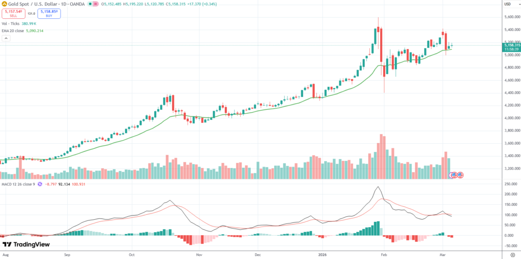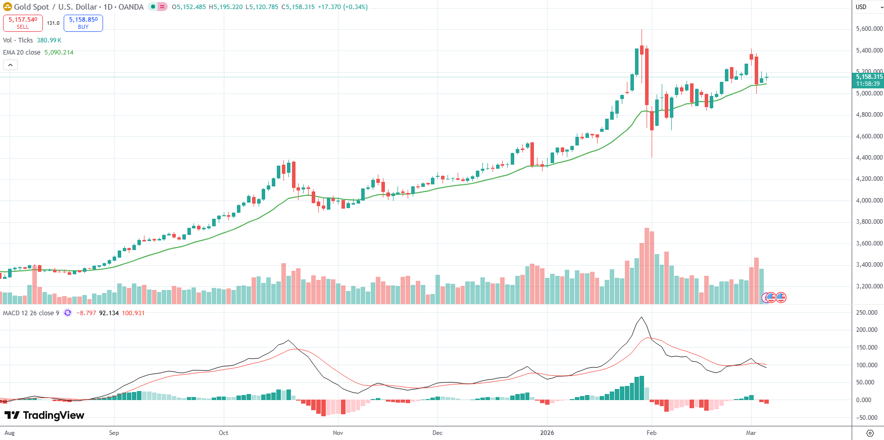 Spot Gold was last up 0.34% on the day to trade at $5,158.31 per troy ounce.