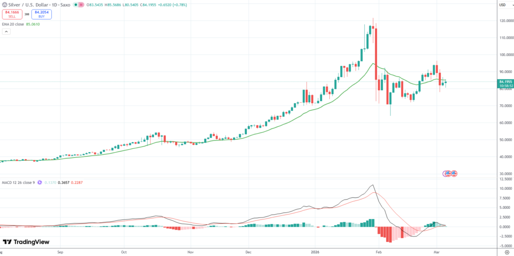 Spot Silver was last up 0.78% on the day to trade at $84.19 per troy ounce.