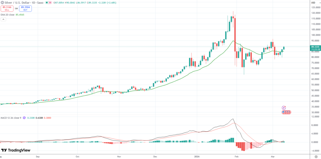 Spot Silver surged to a 1-week high of $90.01 per troy ounce on Tuesday, after US President Donald Trump signaled the Iran conflict might be nearing an end, which pushed the US Dollar and oil prices lower.