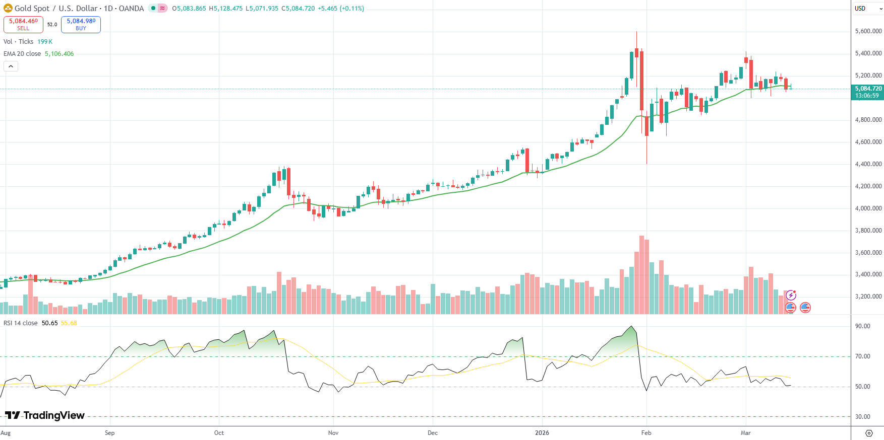 Spot Gold was last up 0.11% on the day to trade at $5,084.72 per troy ounce.