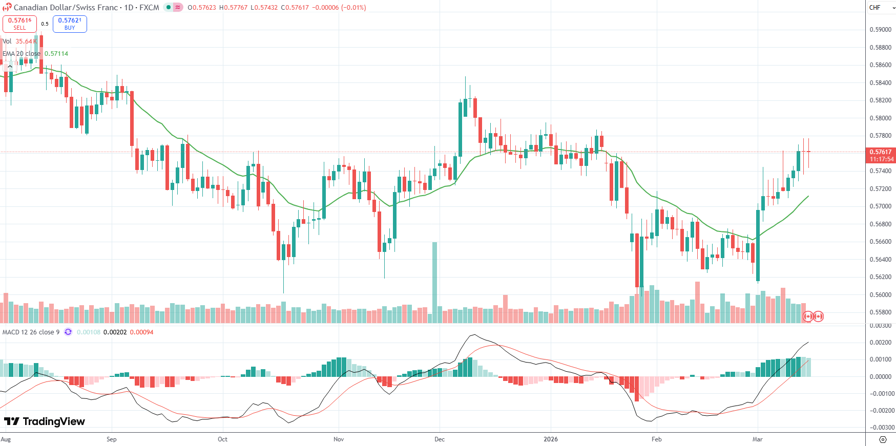 The CAD/CHF currency pair was last down 0.01% on the day to trade at 0.5762.