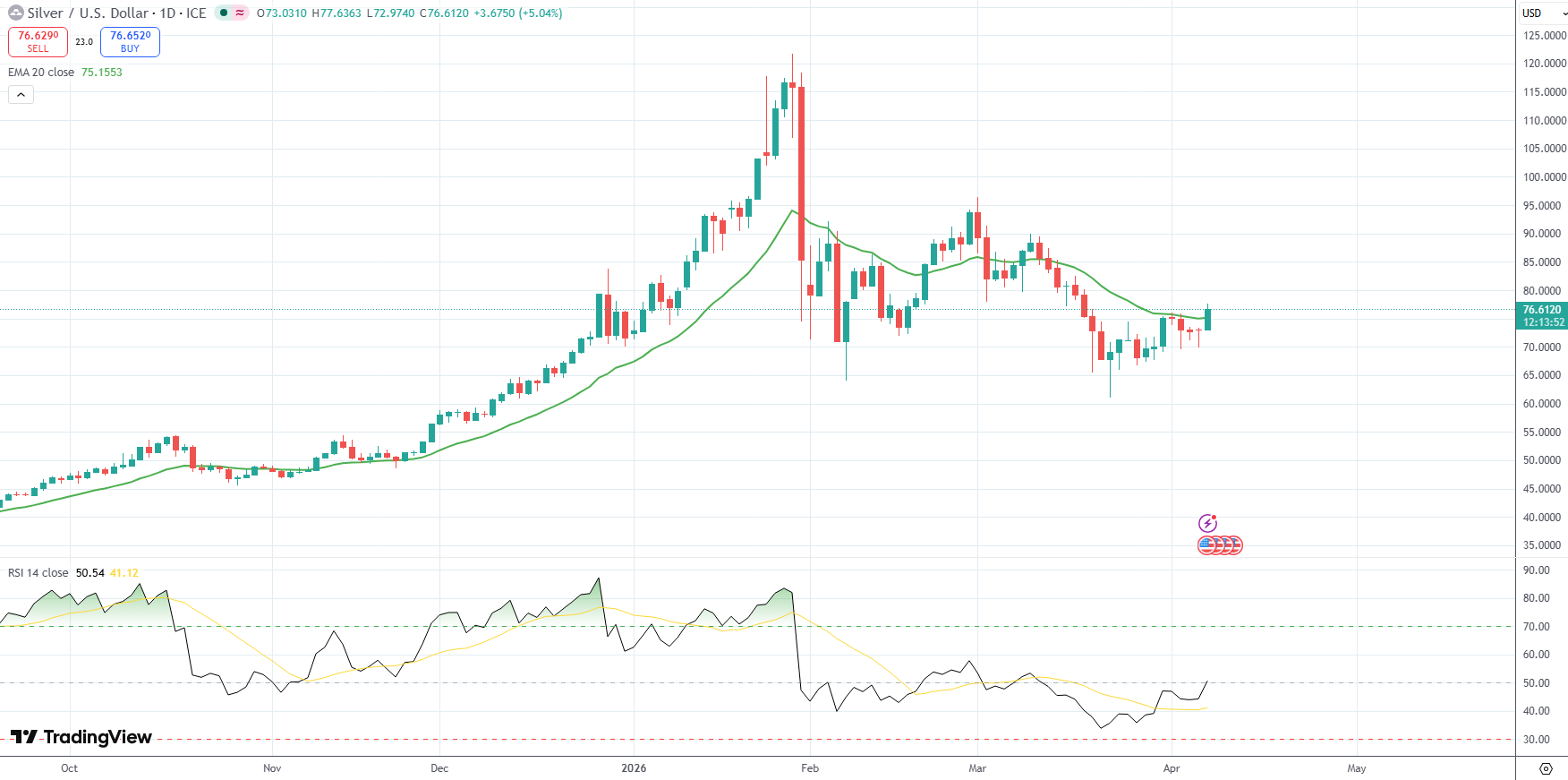 Silver was last up 5.04% on the day to trade at $76.61 per troy ounce.