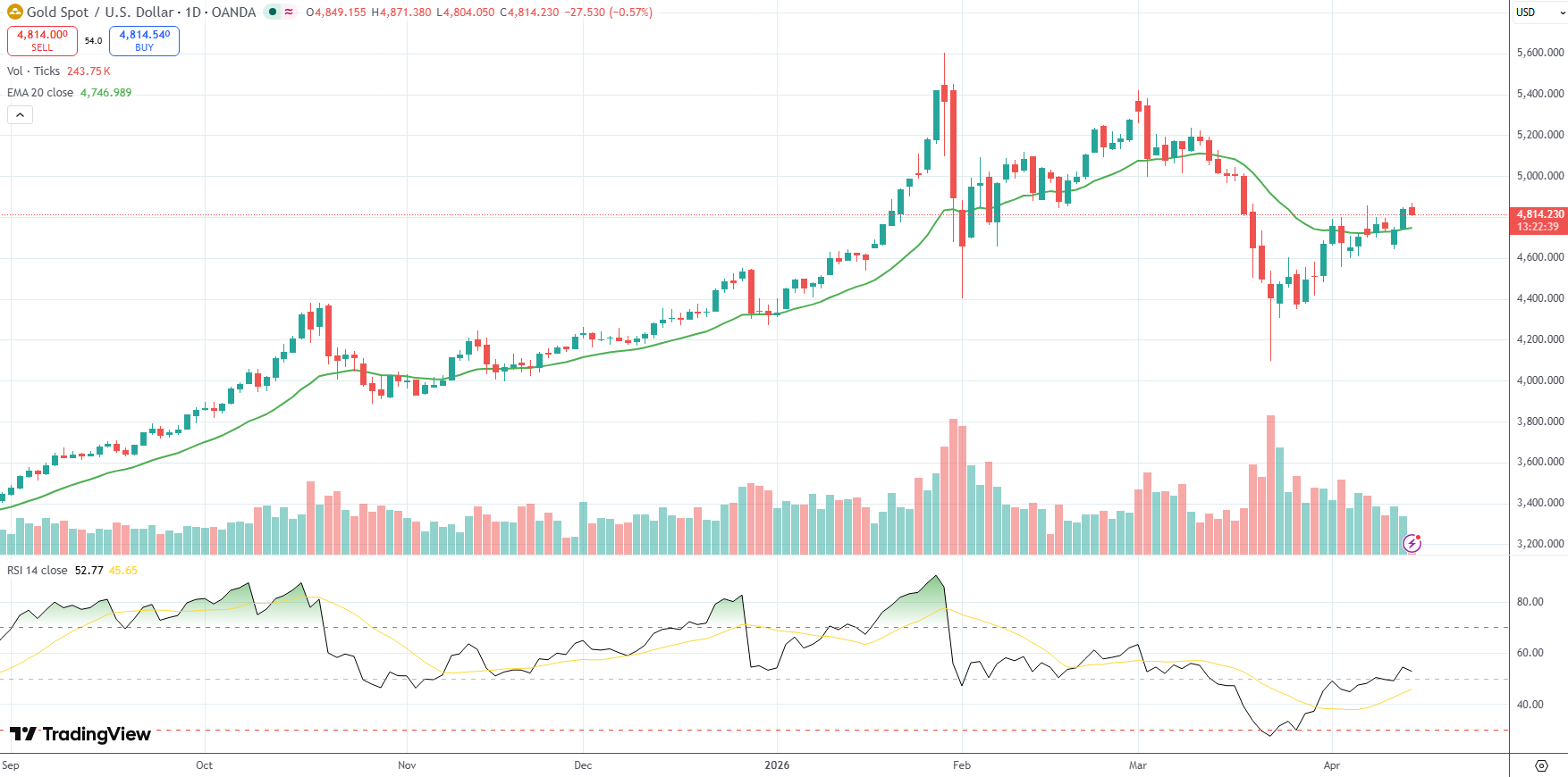 Spot Gold was last down 0.57% on the day to trade at $4,814.23 per troy ounce.