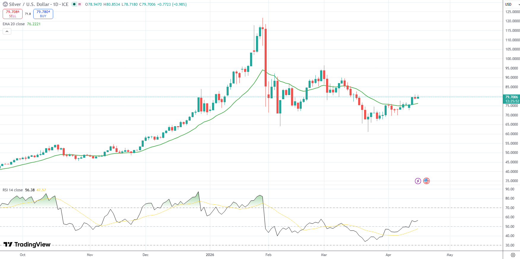 Silver was last up 0.98% on the day to trade at $79.70 per troy ounce.