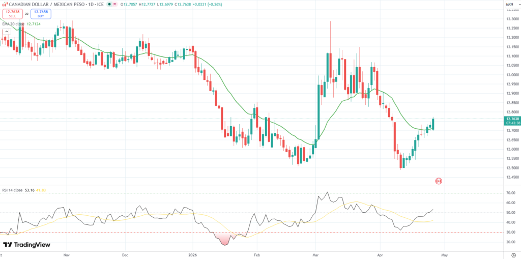 The CAD/MXN currency pair was last up 0.26% on the day to trade at 12.7638.
