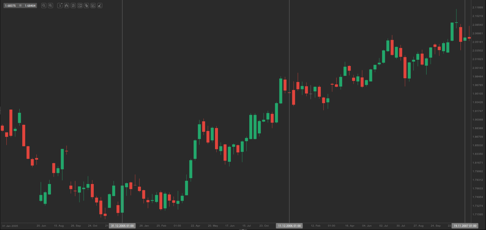 Second, the UK’s currency, also known as ‘Cable’, used to be heavily traded by speculators. Interest rates in the United Kingdom were among the highest in developed countries (with the exception of Australia and New Zealand, where rates were and still are higher, but capital markets are not as developed as those in the UK). Because of this, many investors who were already positioned, or intended to enter new carry-trade positions, often used the pound as the lending currency and bought it while selling currencies such as the yen, the franc or the US dollar. A carry trade involves buying a currency with a higher interest rate and borrowing or selling a currency with a lower interest rate. Almost a decade ago, carry trades became very popular, leading to increased demand for sterling. This can be observed on the weekly GBP/USD chart below.