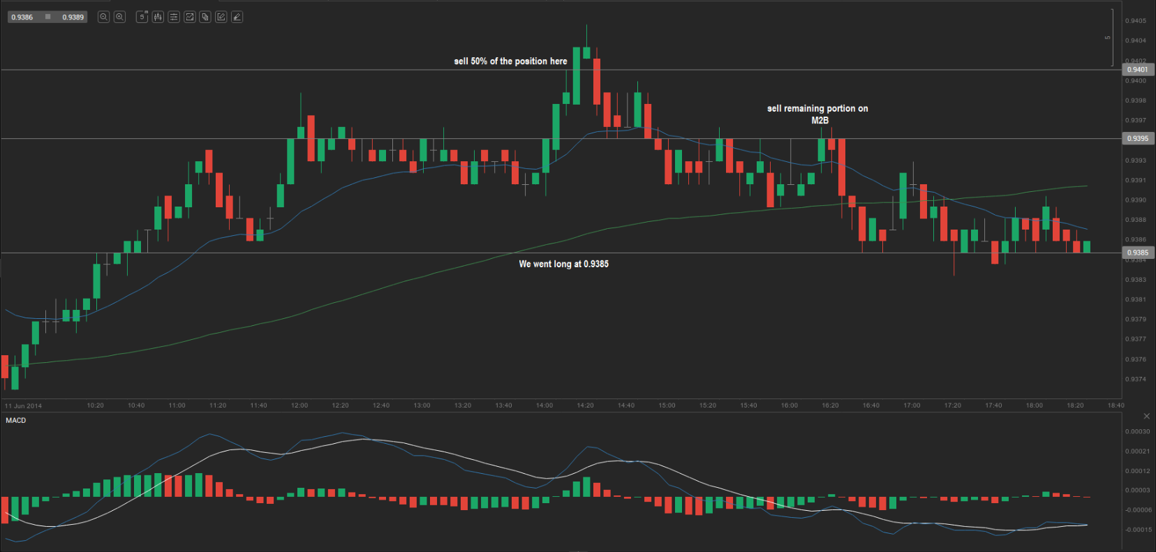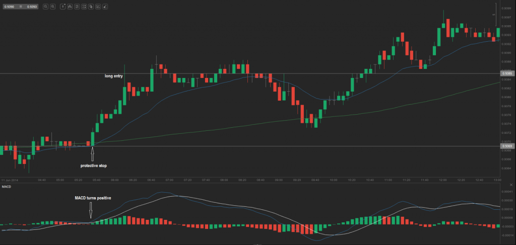 Let us take a look at the 5-minute chart of AUD/USD. On 11 June the pair broke above both the 20-day EMA and the 100-day SMA after a period of consolidation during the Asian session. The MACD had just entered positive territory, and we expected a break above both moving averages of at least 15 pips in order to enter long. The EMA and SMA crossed at 0.9370, so we went long at 0.9385. We placed the protective stop at the low of the candle that broke above the moving averages, namely 0.9369. Our first profit target equals the entry price plus the amount risked. We entered at 0.9385 and set the stop at 0.9369, so the risk was 16 pips. Our first profit target was 0.9385 plus 16 pips, or 0.9401. This target was reached later in the day, so we sold 50% of the position and moved the stop on the remainder to break-even. Later the price fell below the 20-day EMA, but only by a few pips. Because the market began to move against us and we were unable to trail our stop to the 20-day EMA minus 15 pips, we decided to close the remaining portion of the position and capture a further 10 pips at 0.9395. We did so using a fairly good M2B setup. The total profit on the entire position, assuming two lots, was 26 pips, or an average of 13 pips.