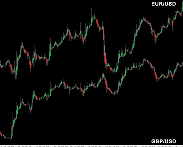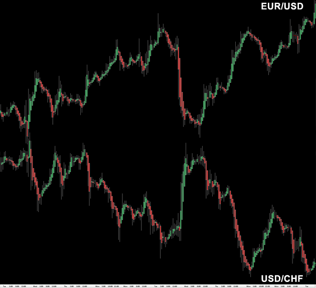 If a trader uses highly negatively correlated pairs (such as EUR/USD and USD/CHF on the one-hour chart below) and takes opposing positions, the effect is the same as taking positions in the same direction in highly positively correlated pairs. For example, entering a long position in EUR/USD and simultaneously a short position in USD/CHF is comparable to entering a long position in EUR/USD and another long position in GBP/USD, or to opening a long position in EUR/USD of twice the usual size.
