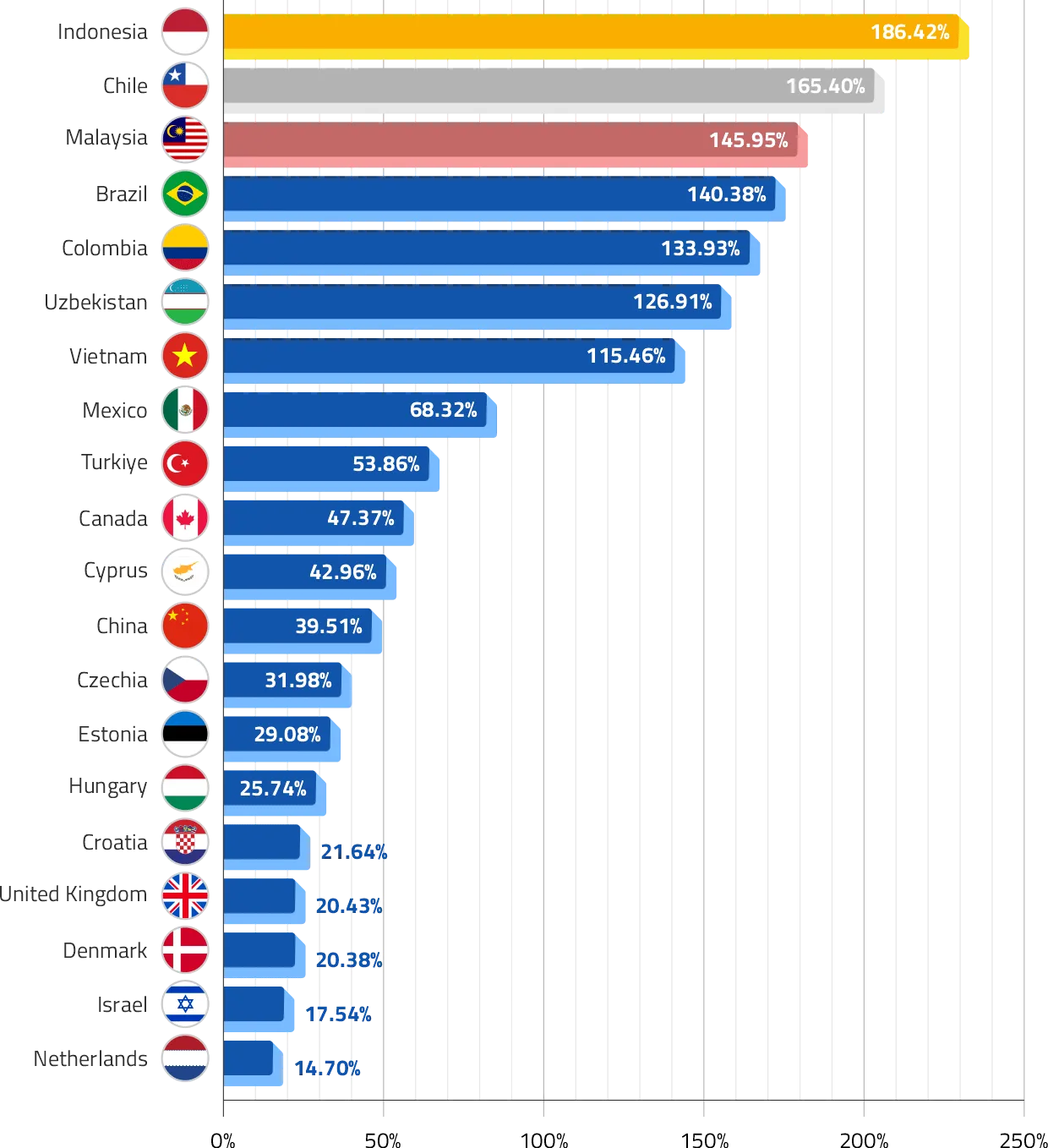 Countries where EV sales increased the most between 2024 and 2025 (Jan-Sep)