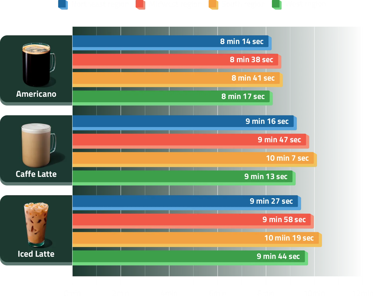 When examining regional trends across the US, a clear pattern emerges in coffee affordability based on geographic location. The South ranks as the least affordable region, with the highest average work times: 8 minutes and 40 seconds for an Americano, 10 minutes and 7 seconds for a Caffè Latte, and 10 minutes and 19 seconds for an Iced Latte. In contrast, the Northeast consistently shows the greatest affordability, requiring only 8 minutes and 14 seconds of work for an Americano, 9 minutes and 16 seconds for a Caffè Latte, and 9 minutes and 27 seconds for an Iced Latte. The West ranks second for affordability, with working times of 8 minutes and 17 seconds, 9 minutes and 14 seconds and 9 minutes and 44 seconds, respectively. In the Midwest, workers need to spend an average of 8 minutes and 38 seconds of labour for an Americano, 9 minutes and 47 seconds for a Caffè Latte, and 9 minutes and 58 seconds for an Iced Latte. These figures reflect a recurring trend: coffee is most affordable in the Northeast and least affordable in the South, demonstrating how regional wage differences significantly influence what a cup of Starbucks really costs.