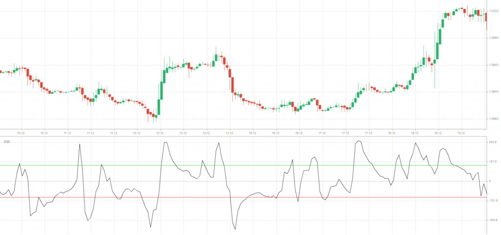 Here we can see how the CCI is displayed on the 1-hour chart of USD/CAD (the black line oscillating between the two extreme levels).