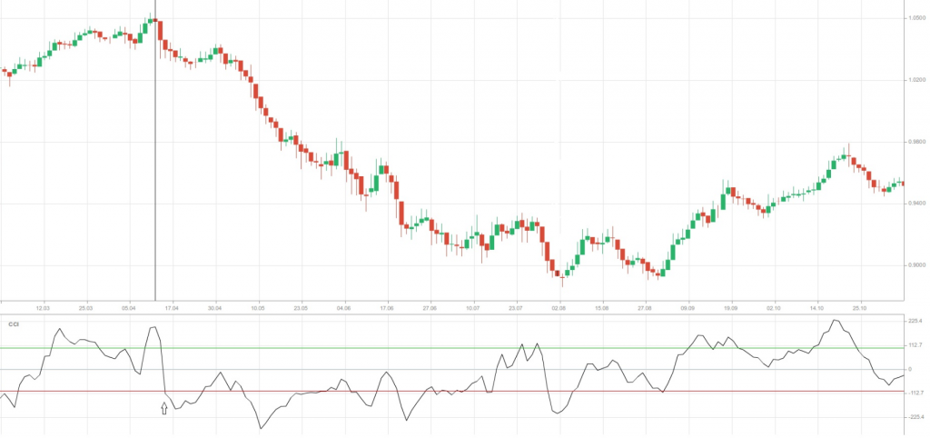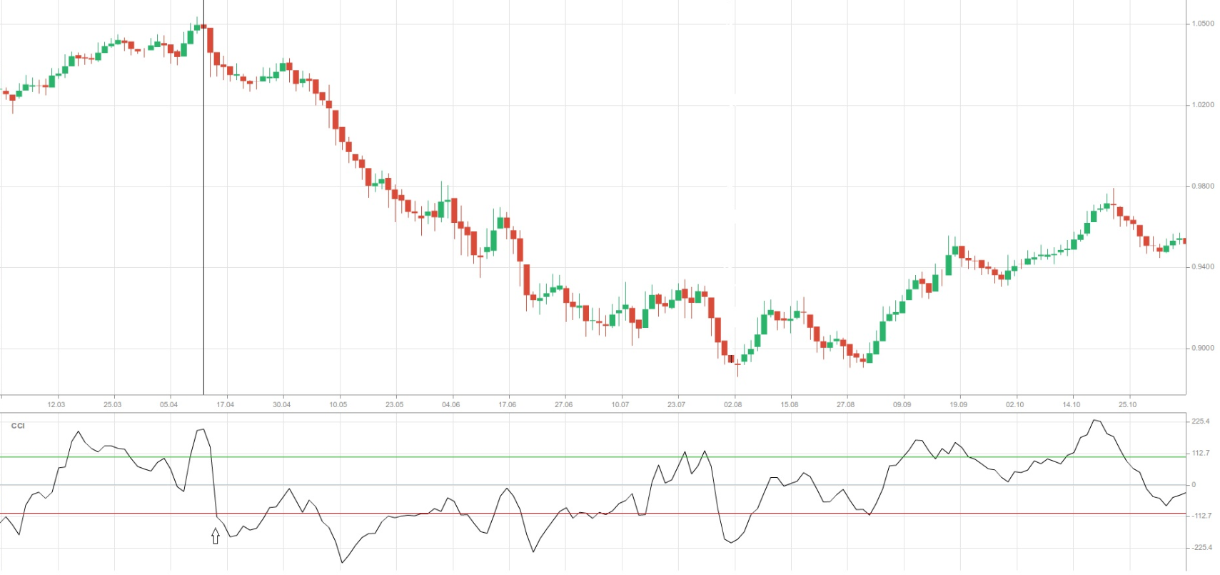 Here we can see a 1-day chart of AUD/USD with CCI (20), overbought level (+100) and oversold level (-100). On 12 April AUD/USD reached a peak and turned lower. The CCI moved below -100 on 15 April, indicating the start of an extended downward move.
