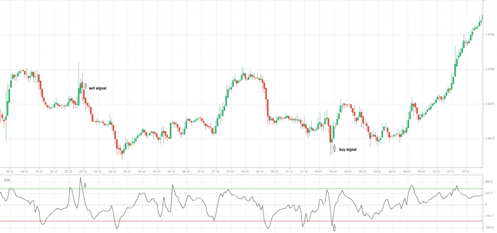 Here we can see a 1-hour chart of USD/CAD with CCI (14), overbought level (+200) and oversold level (-200). On 20 December, after crossing the overbought level, the CCI moved back below it, signalling a sell entry. On 2 January, after crossing the oversold level, the CCI moved back above it, signalling a buy entry. It is crucial to wait for these crosses in order to reduce whipsaws.