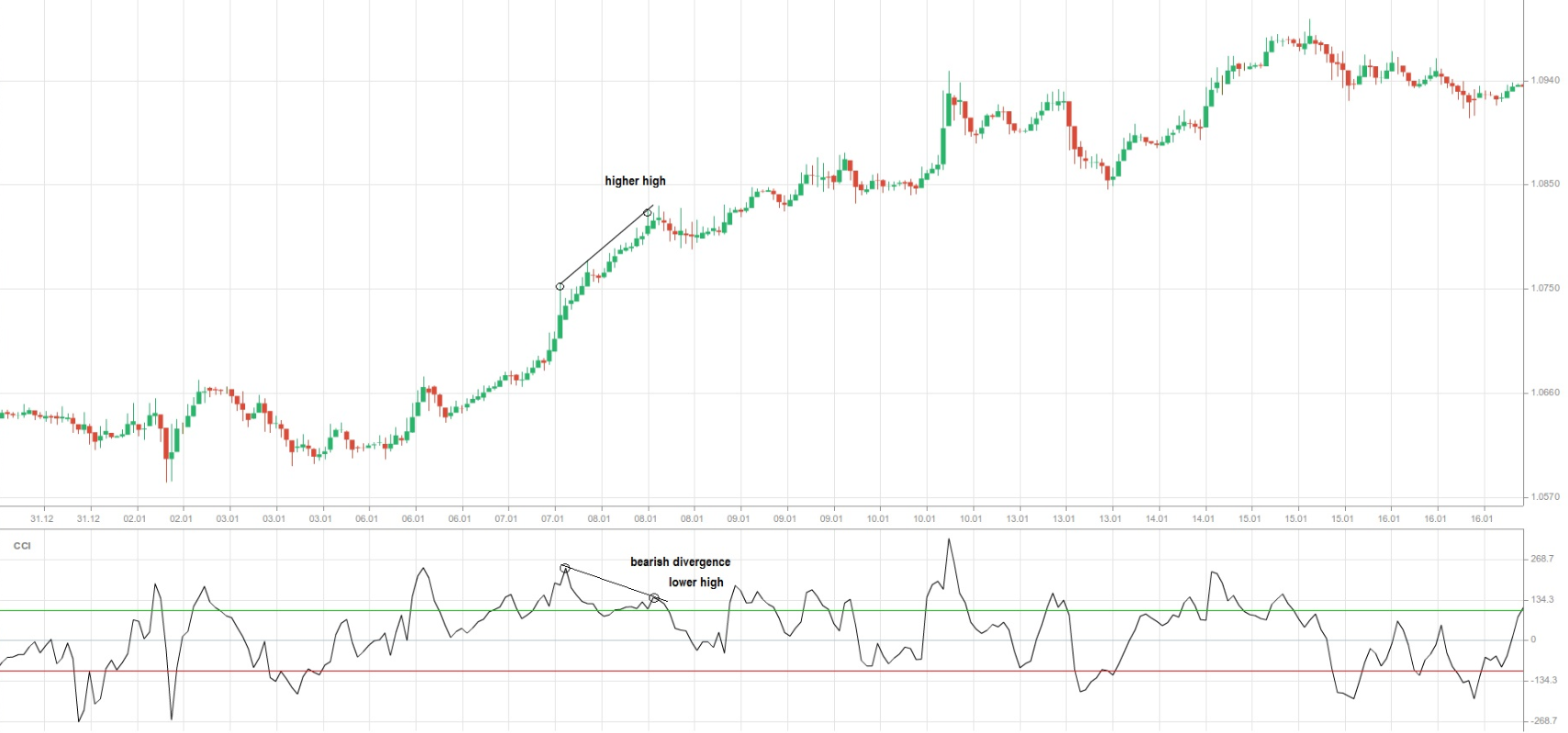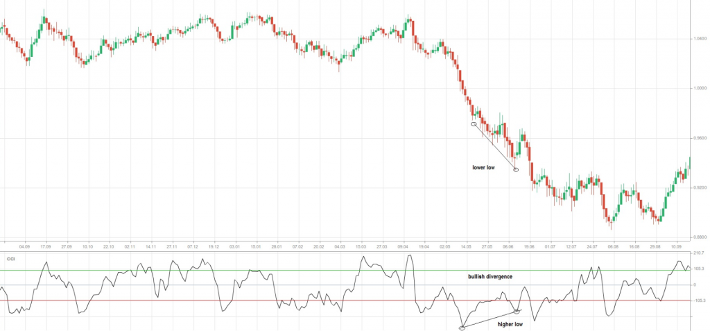 Divergences usually indicate a potential reversal level, as momentum fails to confirm price action. A bullish divergence occurs when the price of the tradable instrument makes a lower low while the CCI makes a higher low, implying that downside momentum is weak. A bearish divergence occurs when the price of the tradable instrument registers a higher high while the CCI makes a lower high, implying that upside momentum is weak.