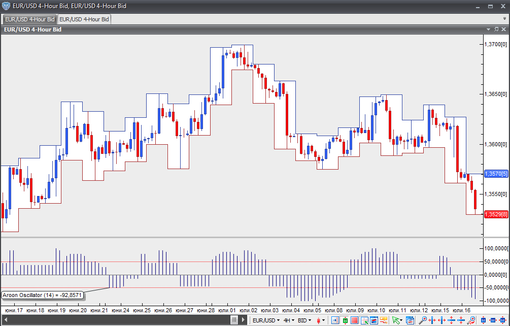 The Aroon Oscillator represents the difference between the Aroon (Up) and Aroon (Down) indicators. It oscillates between -100 and +100, with zero as the centreline. The oscillator reads +100 when Aroon (Up) is 100 and Aroon (Down) is 0. It reads -100 when Aroon (Up) is 0 and Aroon (Down) is 100.