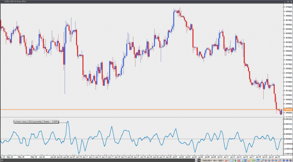 Trading signals are generated when the Kurtosis indicator crosses its zero line. A buy signal is generated when the indicator crosses above the zero line. A sell signal is generated when the indicator crosses below the zero line.