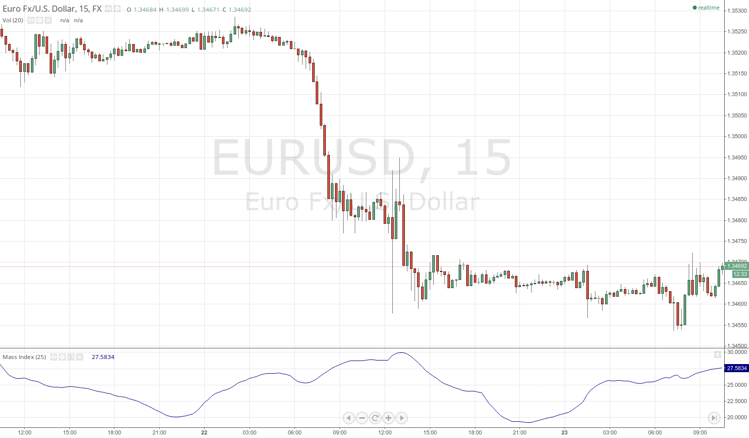 The indicator usually ranges around the mid-20s. According to its creator, the Mass Index’s most important key point and entry level is when its value exceeds 27 and then drops back below 26.5 (when you are using a 25-period sum of the EMA ratio). Here is how the indicator and the pattern look.