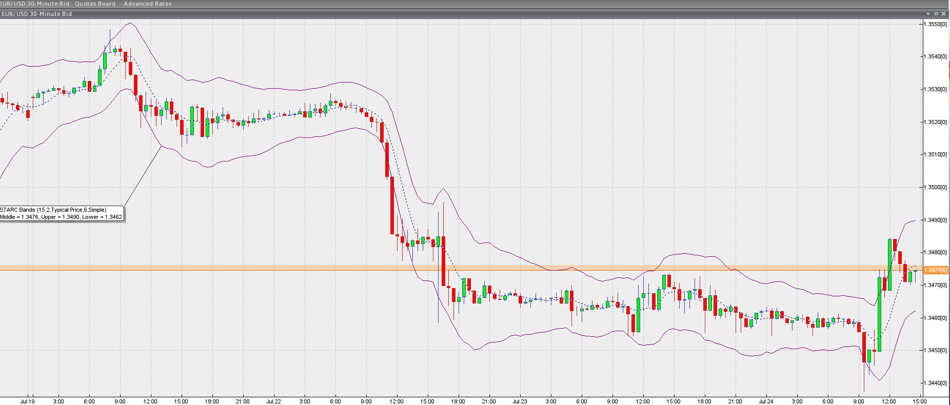 As we said, like any other banding indicator, the STARC Bands are designed to encompass most price action, thereby setting boundaries for ‘normal’ price fluctuations. As a result, any moves that spike out of the STARC channel are considered either excessive or a sign that the current trend is gaining strength (depending on whether the market is moving sideways or trending). Thus, there are two ways to interpret a boundary break, each offering a low-risk, high-probability trade.