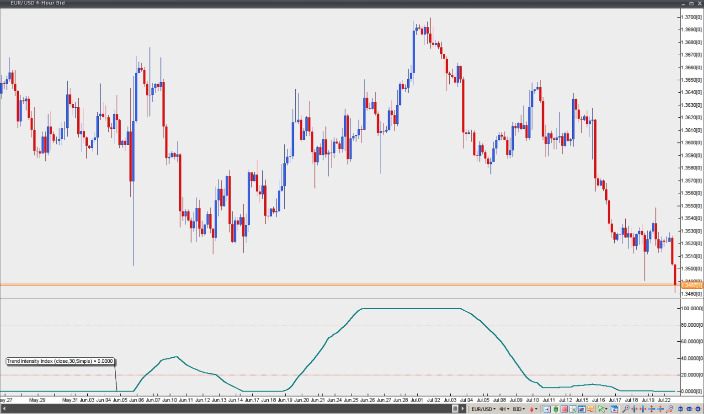 Developed by M.H. Pee, the Trend Intensity Index helps determine how strong the current trend is. The stronger the trend, the higher the chance that the price will continue moving in the current direction. A trader will usually enter the market during a strong trend and ride it until the Trend Intensity Index (TII) signals a reversal.