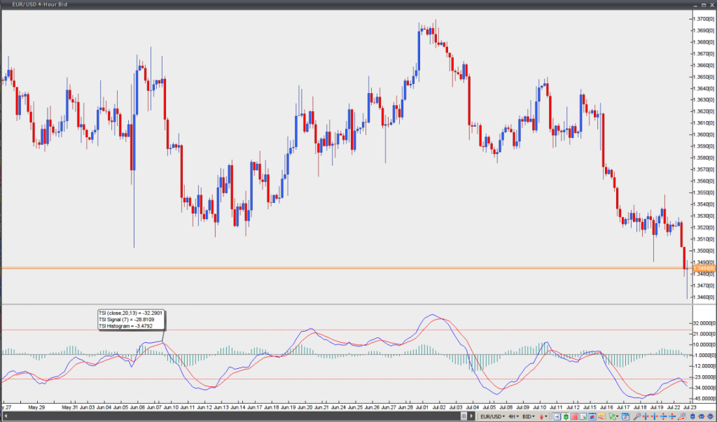 First, crossing the zero line. A signal to buy is generated when the TSI crosses above 0. A signal to sell is generated when the TSI crosses below 0.