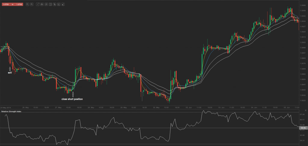 A trader usually looks for a short entry only when the area between the two EMAs is very tight or has been crossed. In addition, the 5-period and 12-period WMAs must cross the area from above to below. If the 5-period WMA also crosses the 12-period WMA from above to below, the signal is further strengthened. The RSI must be below 50.00. The trader closes the position after the market has fallen to a bottom and the 5-period WMA crosses the 12-period WMA from below to above.