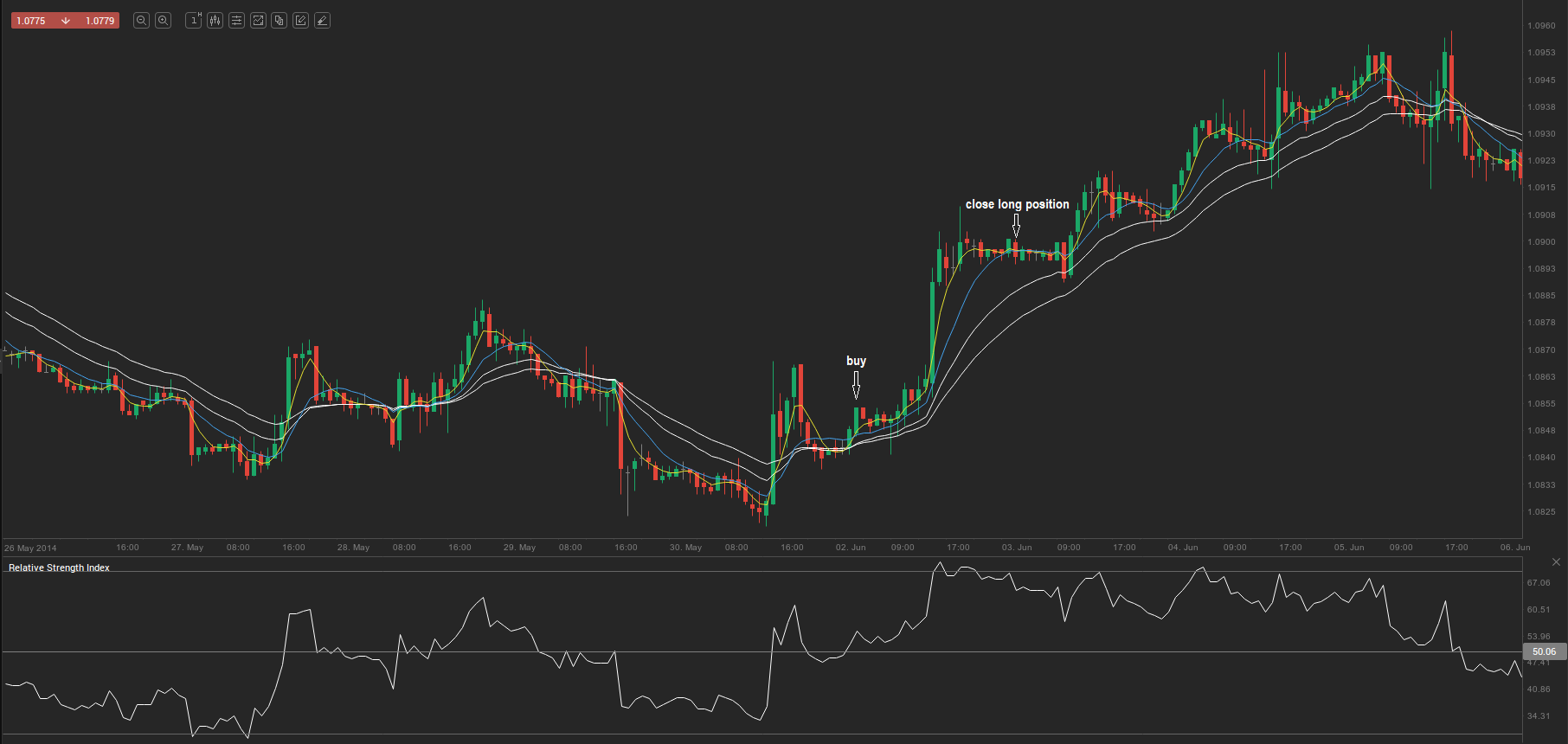 A trader usually looks for a long entry only when the area between the two EMAs is very tight or has been crossed. In addition, the 5-period and 12-period WMAs must cross this area from below to above. If the 5-period WMA also crosses the 12-period WMA from below to above, the signal is further strengthened. The RSI must be above 50.00. The trader closes the position after the market peaks and the 5-period WMA crosses the 12-period WMA from above to below.