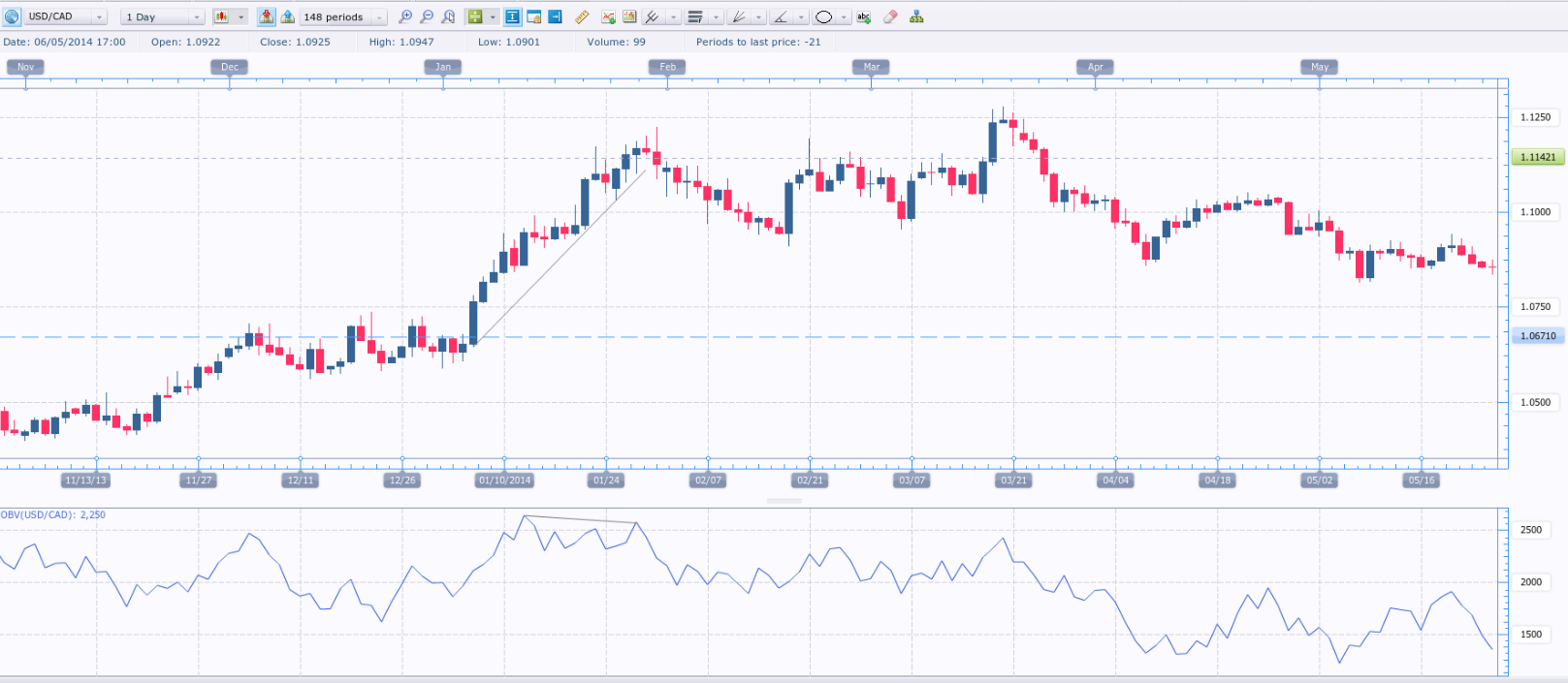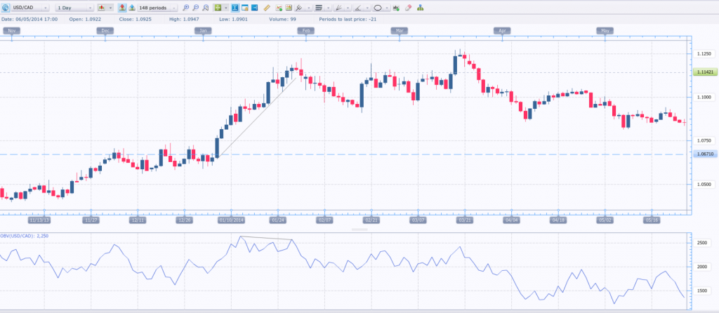 The most reliable buy and sell signals occur when OBV diverges from the price. If the price rises, then falls, and then rises again to a higher high while OBV forms a lower high, a bearish divergence is produced, providing a reliable signal to go short. Conversely, if the price falls, then rallies, and then falls again to a lower low while OBV forms a higher low, a bullish divergence is produced, signalling a long entry. Longer-term divergences are more reliable than shorter-term ones: patterns that develop over several weeks give more dependable signals than those that form over a few days. The daily chart of USD/CAD below shows a typical bearish divergence between price and OBV.
