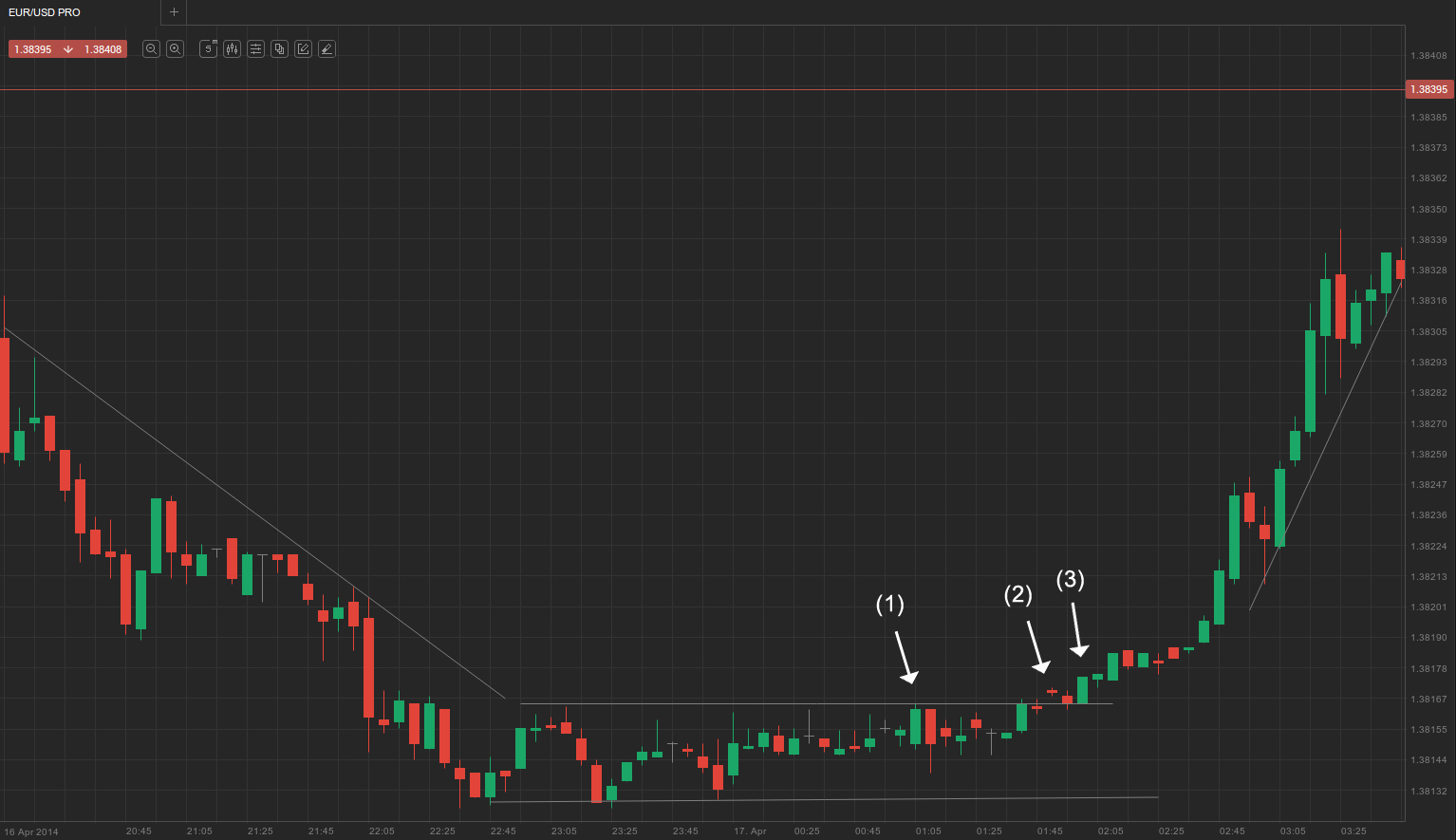 Very often you can see a trading range break out and continue the initial trend, with the second move being as extensive as the first. The continuation is preceded by a failed counter-trend breakout from the trading range. However, in the screenshot above you can see that this wasn’t the case.