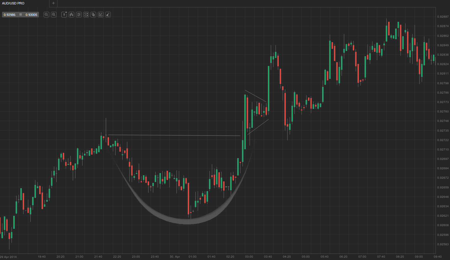 Basically, when the price breaks out of a trading range but fails to retain its momentum and later re-enters the trading range, it’s called a false breakout (failed breakout, or fake-out). If, however, there is a pullback to the breakout (the price stalls around the breakout point instead of re-entering the trading range) and the breakout-level test is successful (the price rebounds and resumes the trend instead of re-entering the trading range), the failed breakout is said to have failed – in other words, it is a Failed Failure, or it has become successful. Some traders also refer to this scenario as a cup and handle pattern. Here is an example.