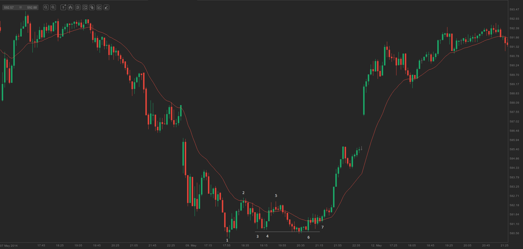 On the 5-minute chart of AAPL above, bar 1 marked the end of a steep second leg to the downside and was a probable reversal setup. Although the move up to bar 2 was small, neither the low of bar 3 nor that of bar 4 managed to undercut the prior low, and these two bars produced a small Double Bottom Bull Flag. The low of bar 6 was slightly lower than that of bar 3 but still failed to break the low of bar 1; consequently, bars 3 and 6 formed a larger Double Bottom Bull Flag. Institutional traders were probably defending the low of bar 1 rather than attempting to trigger protective stops, which could indicate that they expected the price to rise. Bar 7 was an M2B setup.