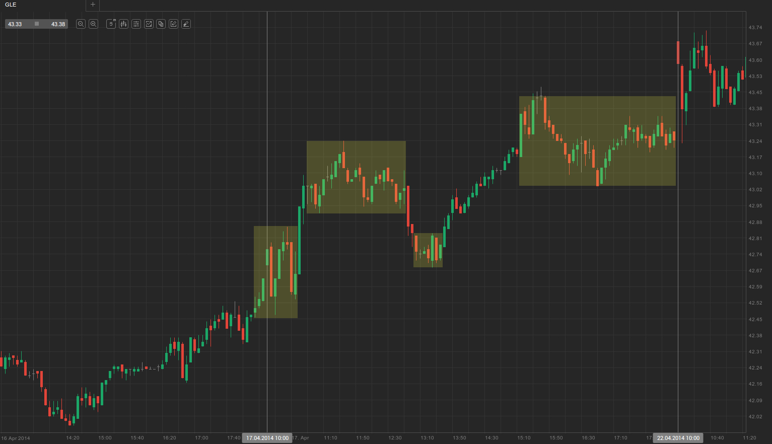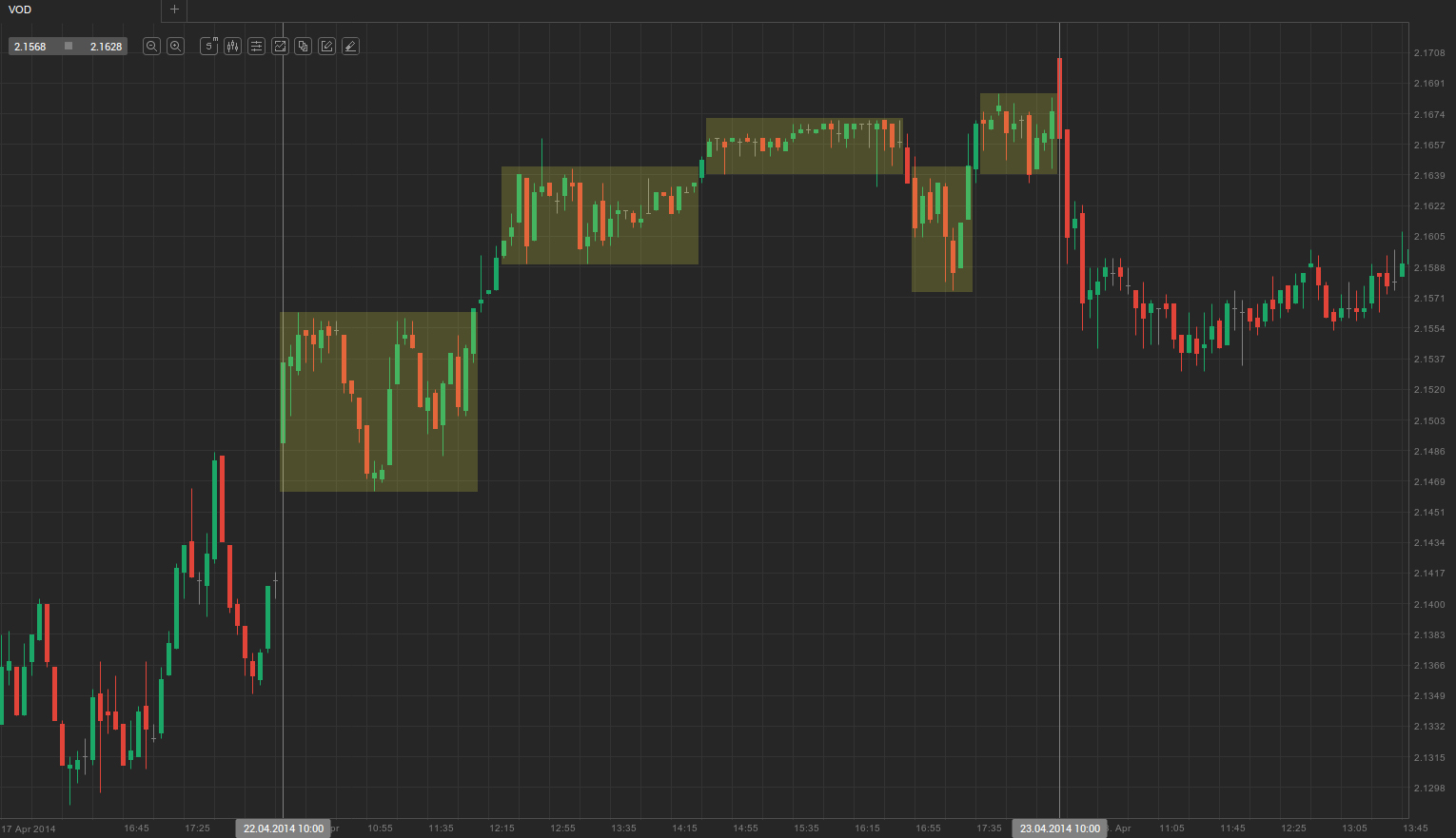 Another peculiarity of trending range days is that, because sideways trading has dominated the entire session, the market is often observed to reverse through at least one of the trading ranges in the last two hours of the day. This is due to the trading range vacuum effect. Such a scenario is illustrated in the screenshot below.