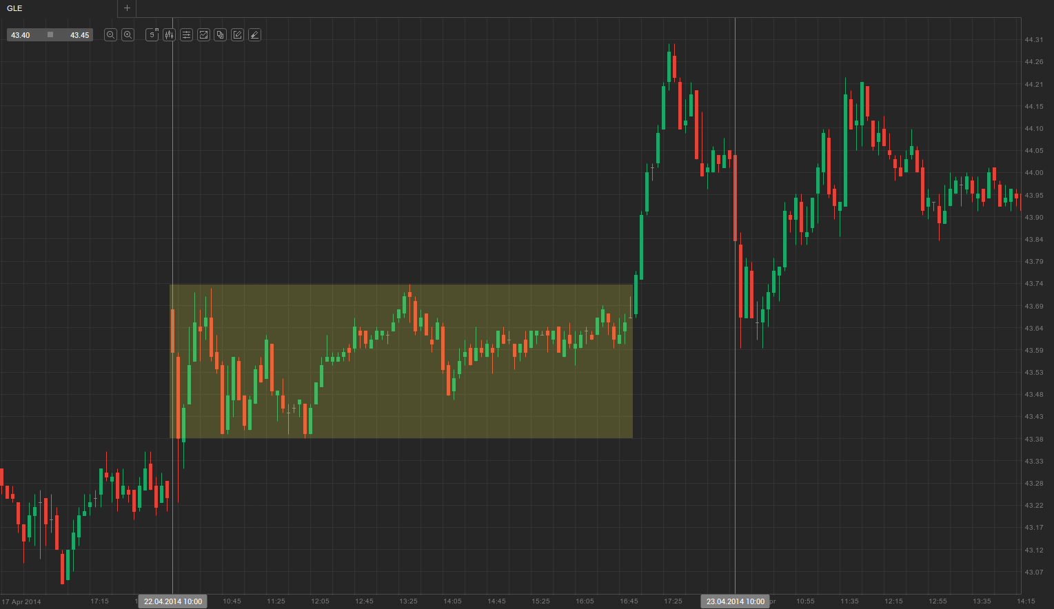 Sometimes the initial trading range continues throughout most of the day. Although it displays the characteristics of a typical opening trading range during a trending range day, the breakout does not occur until the final hour or two. Although there may not be enough time for the market to establish a higher or lower range, the move still fulfils the breakout setup of a trending range day anticipated by market participants. See the screenshot below.