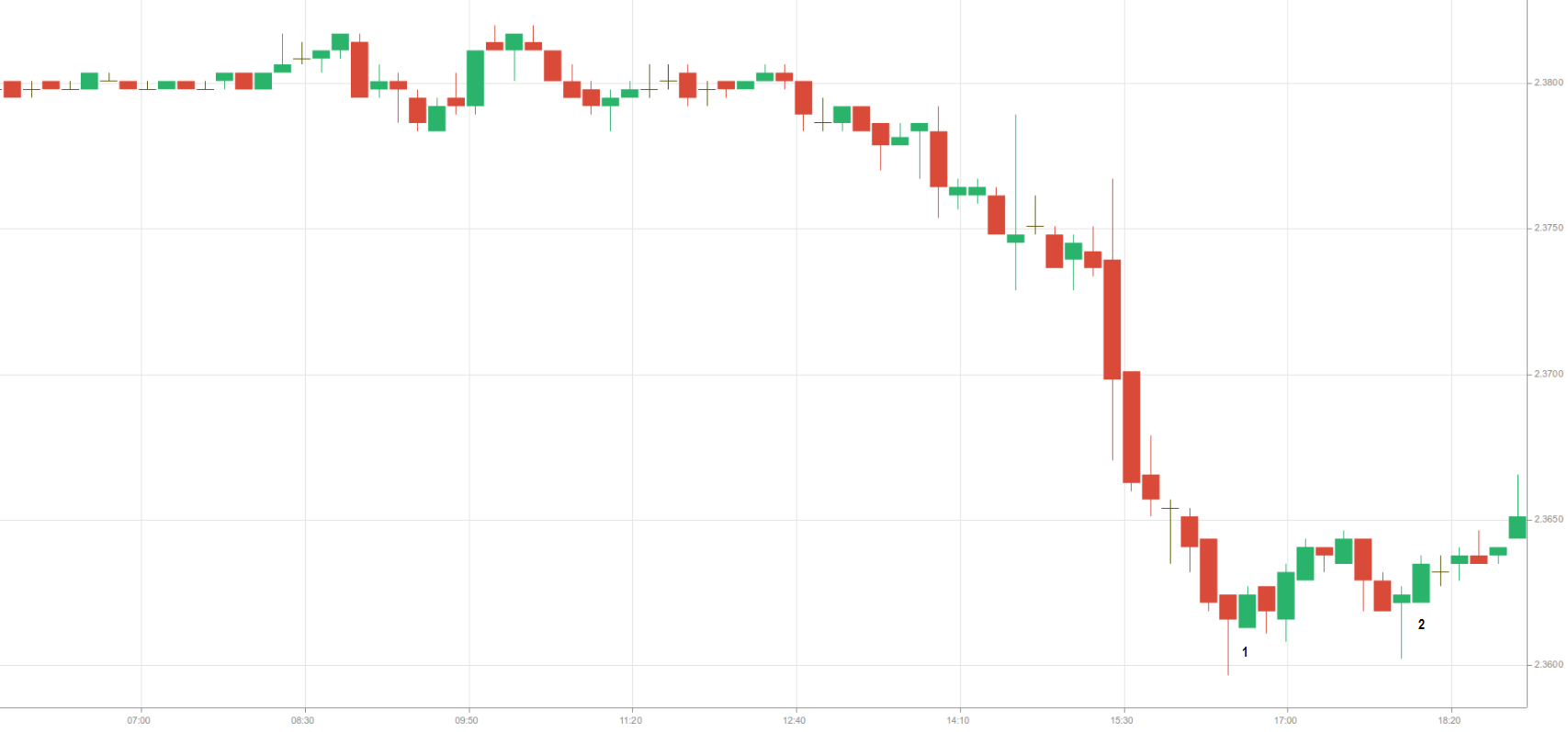 On the 10-minute chart of GBP/BGN above, bar 1 formed after seven bars with bearish closes, which implied too much downward momentum. Thus, a long entry on bar 1 would have been a risky move. Astute traders would instead wait to see whether the bears would succeed in dragging the price to the daily low for a second time. As they failed to do so, a secondary entry could have been made on bar 2.