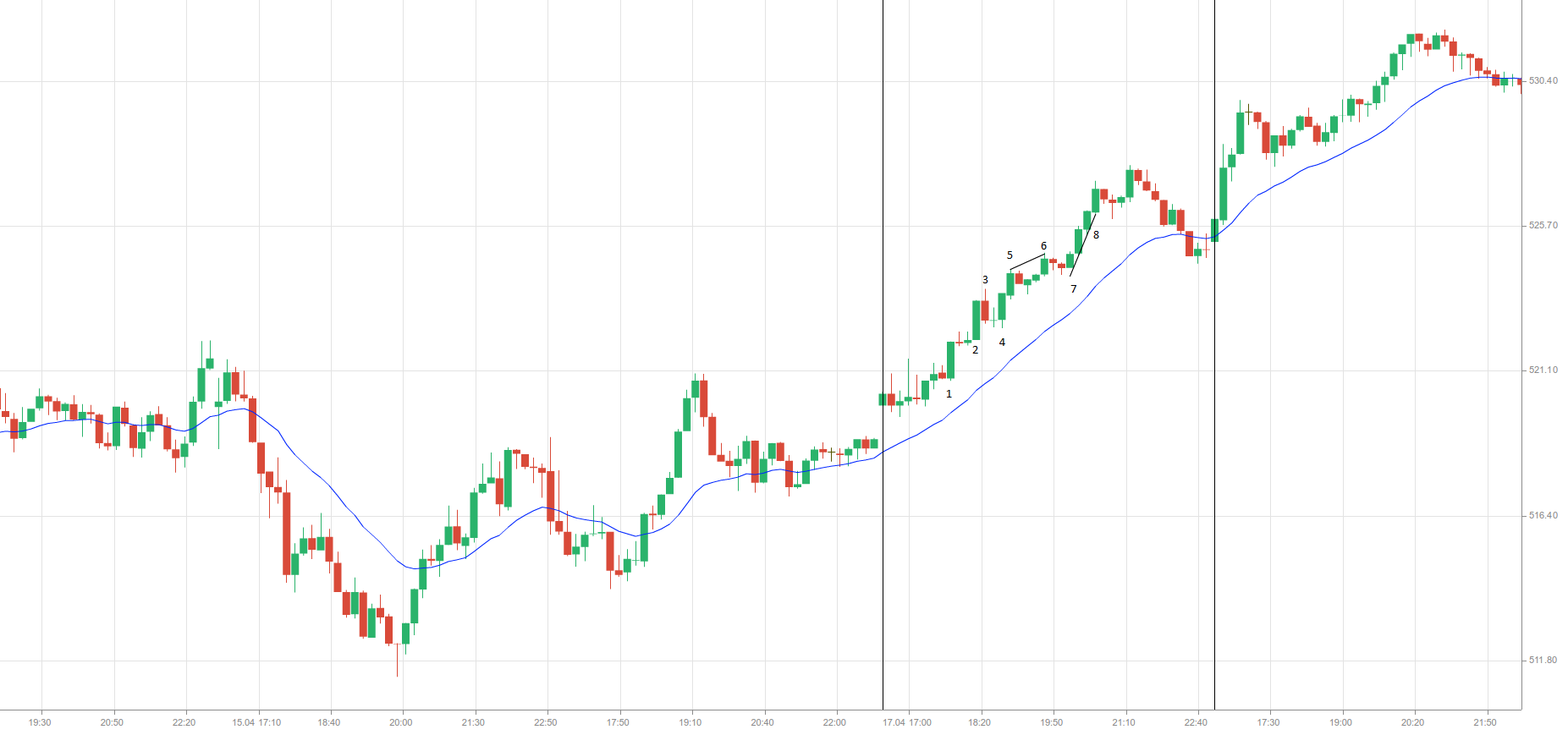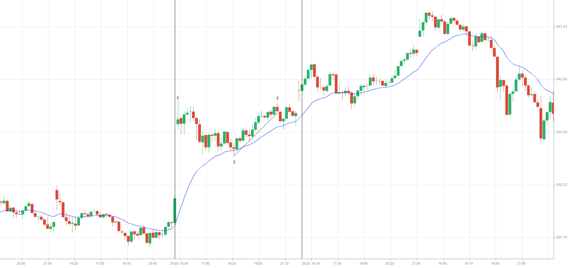 At times, a gap can appear instead of a spike, creating a gap plus channel trading day. This is visualised on the 10-minute chart of AAPL above. The move from bar 1 to bar 2 formed a bull flag, which led to a channel from bar 2 to bar 3.