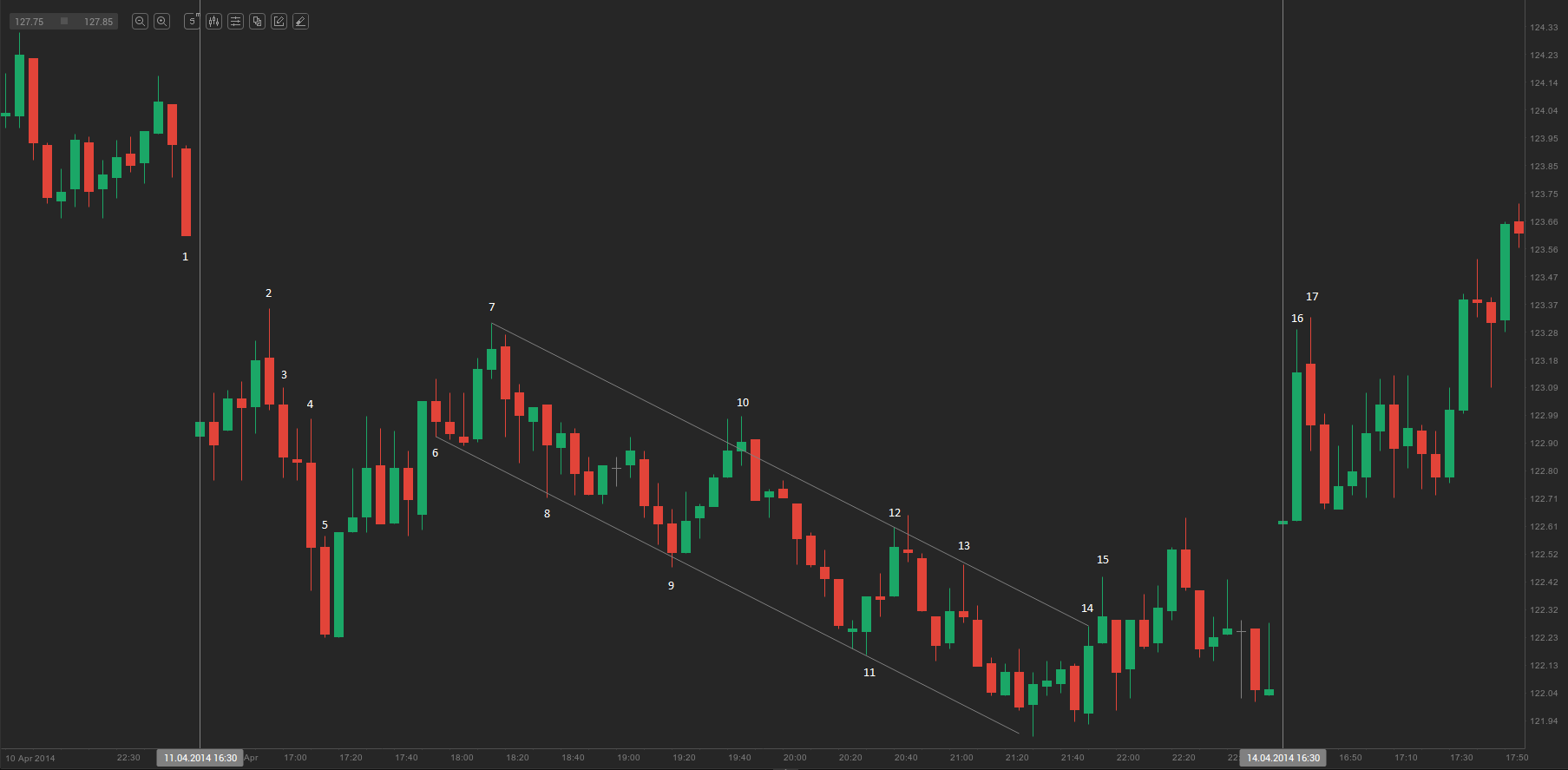 Bar 15 broke above the bear channel. As prices tend to test the starting point of channels, traders may now look for long setups. However, the test of bar 7’s high did not occur until the next trading day (14 April). The beginning of the bear channel was tested by the high of bar 16 and exceeded by bar 17.