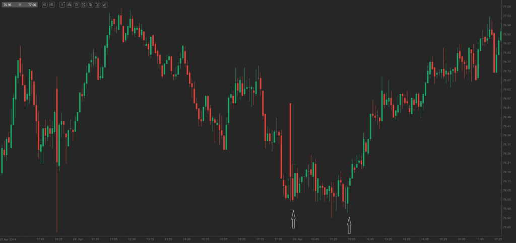 On the 5-minute chart of ADS above there was a considerable sell-off, followed by a trading range made up of large trend bars and bars with long wicks, which led to a reversal. This setup formed a double-bottom pullback pattern.