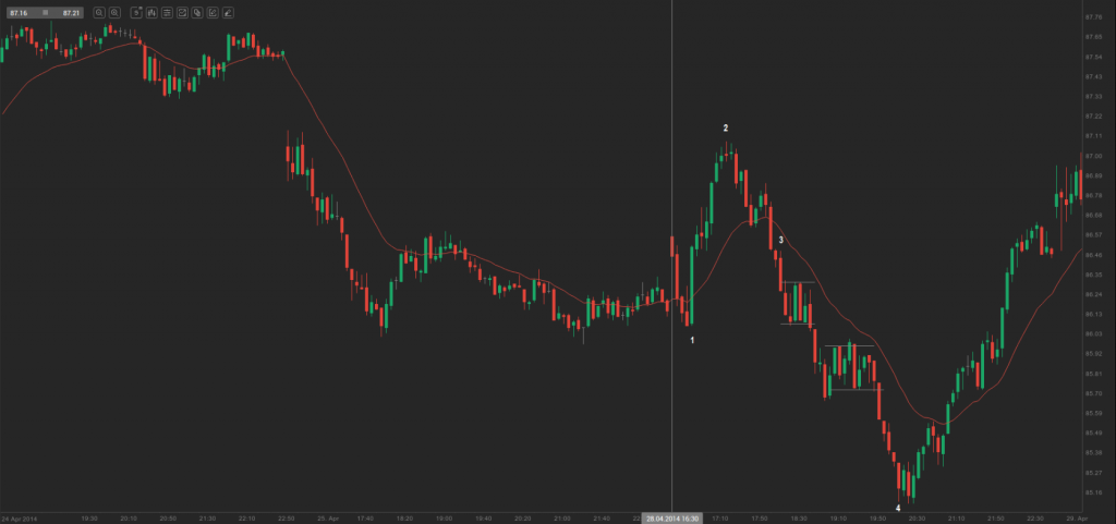 A trading range may form when the price makes a large move to the upside followed by a large move to the downside that retraces almost the entire upward move. However, such a scenario can also lead to a new trend rather than a range. In this case, a trader should look for a reversal formation after the second move ends. If a reversal occurs, it will usually be sufficient at least for a scalp. If no reversal is present, the second move can simply continue to trend, with its first measured target probably being at least twice the height of the first move.