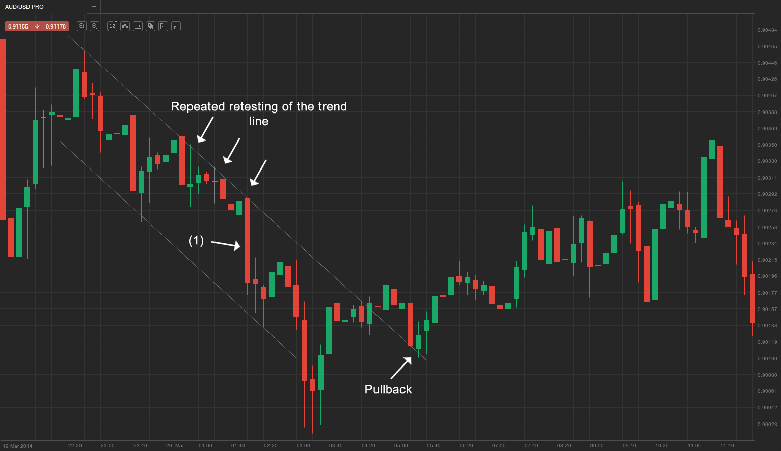 In the second scenario, repeated retesting of the trend line often results in the price bouncing off it and accelerating towards the trend channel line as the counter-trend traders finally capitulate. If it is a bearish trend, they will exit their long positions at a loss and refrain from entering in the same direction until the market has dropped significantly. They aim to repeat the exercise and go long again as soon as the price touches or overshoots the trend channel line. Check out the following example.