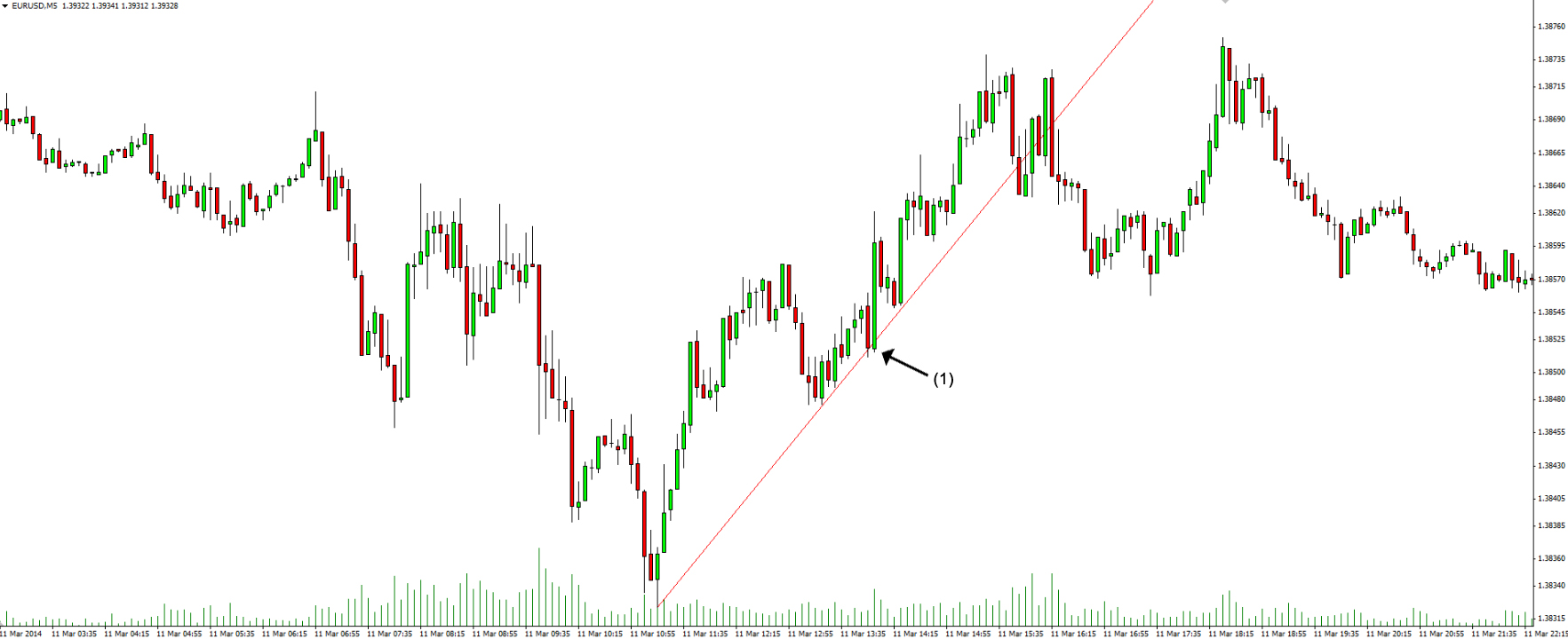 What is important to remember about trend line breaks is that, even though they often fail to reverse the trend, they visualise the first point during the trend at which the market was not controlled solely by the bulls or the bears. The strength of the break also shows how strong and decisive the counter-trend traders are, but that strength is unlikely to emerge on the first attempt. After a trend line break, the market often retests the trend’s extreme, for example by dropping to a lower low or a higher low relative to the bearish trend’s extreme, and vice versa. On the screenshot below you can see how the trend rebounds with an almost double-shaved bar to a new high after a trend line break.